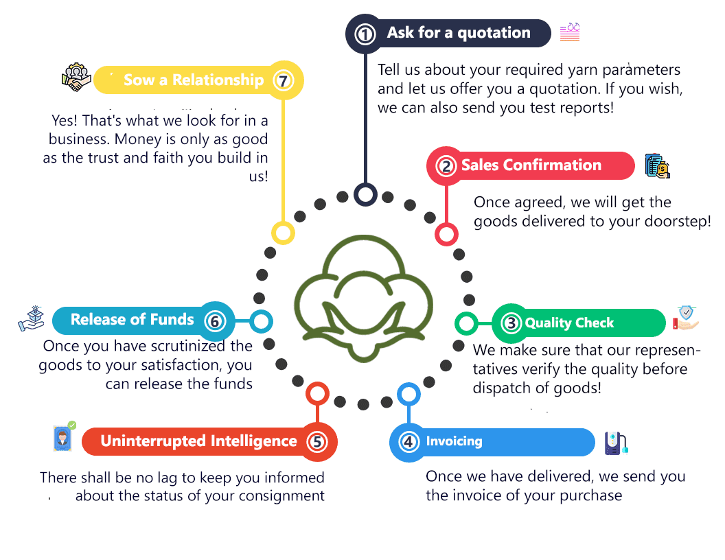 While you agree upon the yarn parameters, the quantity and the quality; leave it on us to take responsibility of procurement, logistics, quality checks and delivery to your door step!